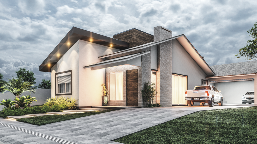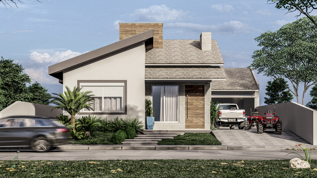 Esta obra possui 171,93m2 sendo duas suítes, dois dormitórios, um banheiro social, lavanderia, sala e cozinha conjugadas, sendo o terreno de 15x25, frente norte, fachada com revestimentos cerâmicos definidos pelo escritório, telhado aparente e com garagem para dois carros.