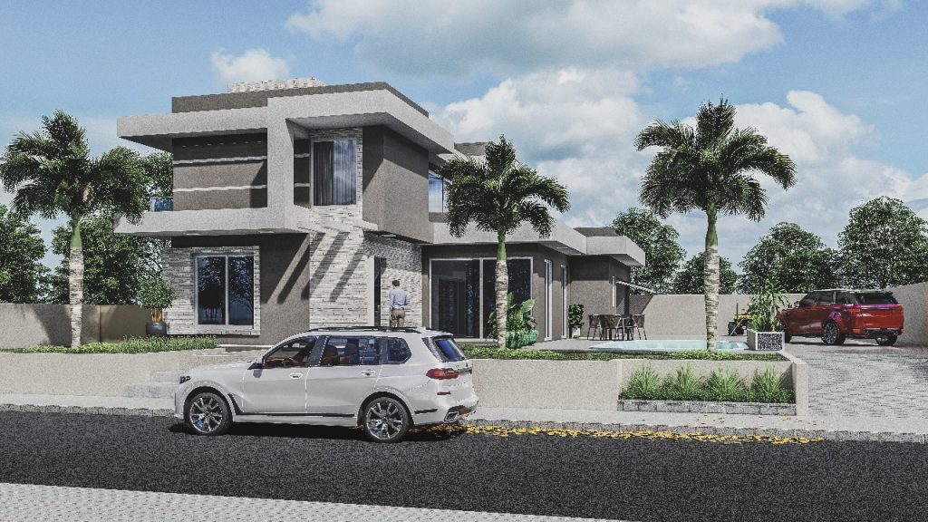 Esta obra possui 203,63m2 sendo um banheiro social, lavanderia, sala e cozinha conjugadas e no superior da casa possui três dormitórios, um banheiro e uma suíte sendo o terreno de 24x25, frente norte, fachada com revestimentos cerâmicos definidos pelo escritório, telhado com platibandas e garagem para dois carros.