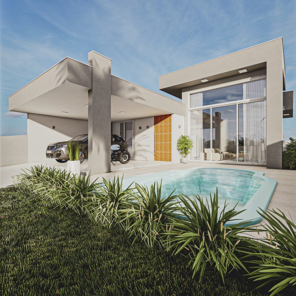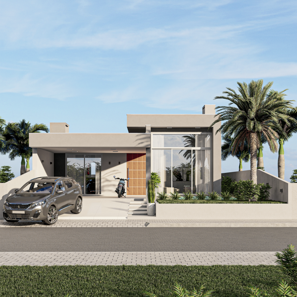 Esta obra possui 151,55m2 sendo uma suíte, dois dormitórios, um banheiro social, um lavabo, lavanderia, sala e cozinha conjugadas, sendo o terreno de 12x25, frente norte, fachada com revestimentos cerâmicos definidos pelo escritório, telhado com platibandas e garagem para dois carros.