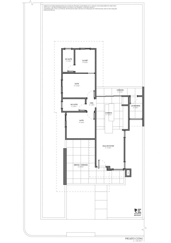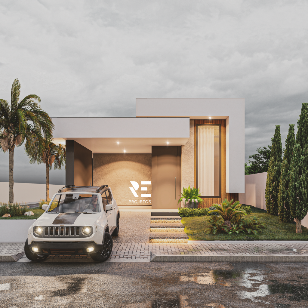 Esta obra possui 108,50m2 sendo uma suíte com closet, um dormitório, um banheiro social, lavanderia, sala e cozinha conjugadas, sendo o terreno de 12x25 frente norte, fachada com revestimentos cerâmicos definidos pelo escritório, telhado com platibandas e uma garagem para um carro.
